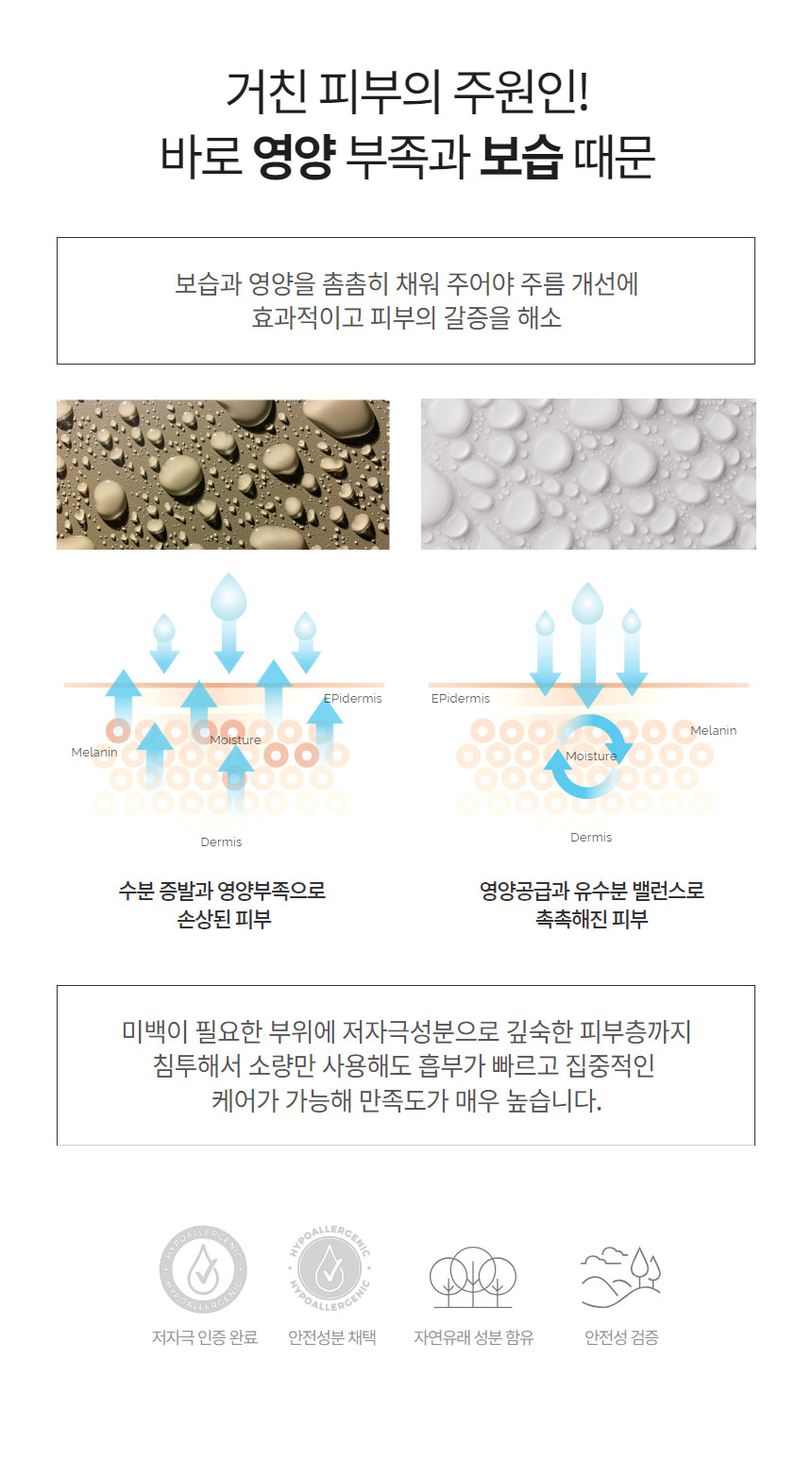 | 모든 원료성분 | 정제수, 스쿠알란, 아스코르빅애씨드, 미네랄오일, 피이지/피피지-5/20 토코페릴 에테르, 알부틴, 사이클로메치콘, 디프로필렌글라이콜, 부틸렌글라이콜, 옥틸도데칸올, 피이지-32, 소듐바이설파이트, 토코페릴아세테이트, 피이지-5 토코페릴 에테르, 디메치콘, 메도우폼씨오일, 쉐어버터, 라놀린, 디메치콘 코폴리올, 파라핀, 비즈왁스, 디소듐이디티에이, 나이아신아마이드, 세라마이드, 비에이치티, 시트릭애씨드, 향료, 글리세린, 토코페롤, 에탄올, 달맞이꽃 오일 |